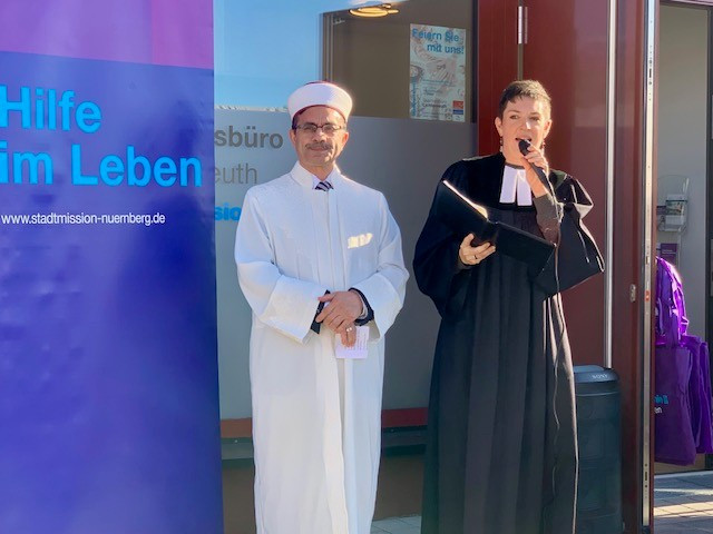 Den Segen sprachen zusammen Pfarrerin Julia Popp und Mehmet Çelik, Imam der DITIB – Türkisch Islamische Gemeinde zu Erlangen e.V.