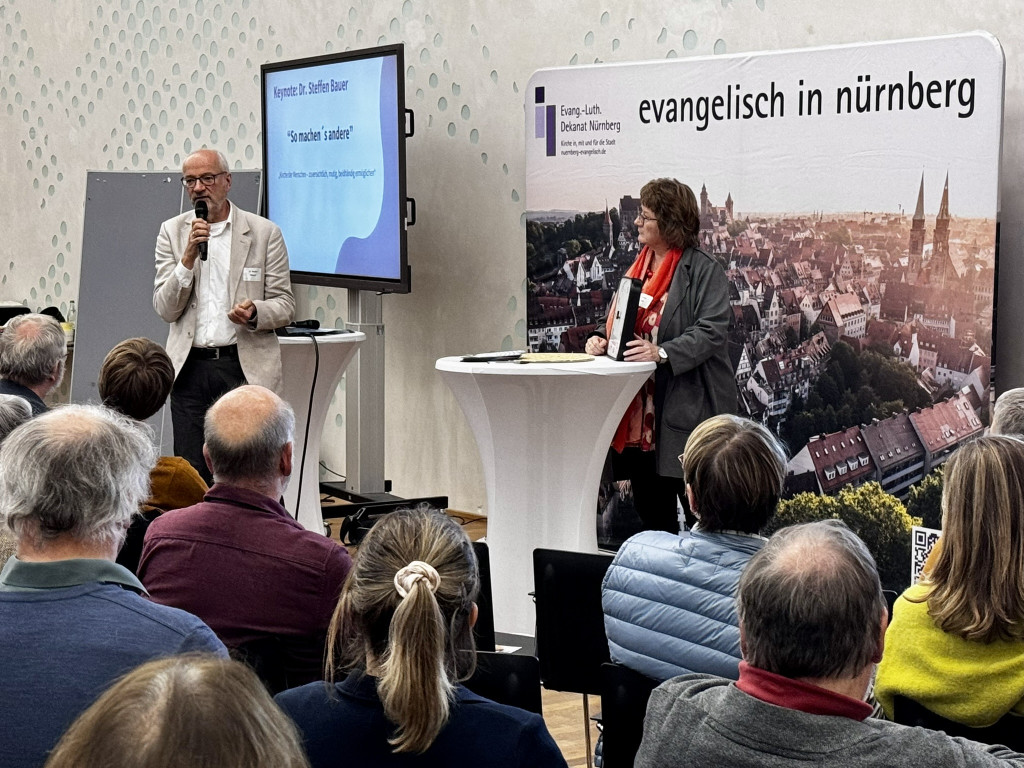 Die Keynote-Speech "Wie machen's andere..." hielt Dr. Steffen Bauer, Spezialist in Veränderungsprozessen in der Kirche mit EKD-weiter Erfahrung. Aufbauend auf den Prozess "Profil und Konzentration" (2017 bis 2019) sei in Sachen Kirchenentwicklung in Nürnberg bereits viel getan worden, lobte er. Neue kreative Formen von Kirche würden erfolgreich erprobt und von der Kirchenleitung auch zugelassen, ermöglicht und unterstützt.