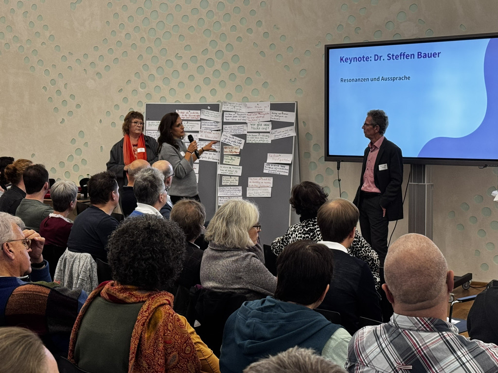 Die Teilnehmenden des Zukunftstages nutzten im Anschluss die Gelegenheit mit dem Referenten Dr. Steffen Bauer über ihre Fragen und Themen ins Gespräch zu kommen, bevor Dekanin Britta Müller vorstellte, was auf Dekanatsebene bereits konkret im "Change"-Prozess passiert ist und wie mit den Herausforderungen weiter gut umgegangen werden kann.